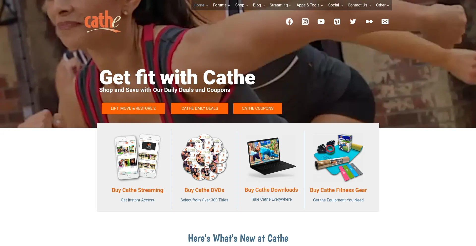 网站上存在社交媒体链接表明 cathe.com 在社交媒体上维护官方账户,这是可信度和参与度的积极信号。