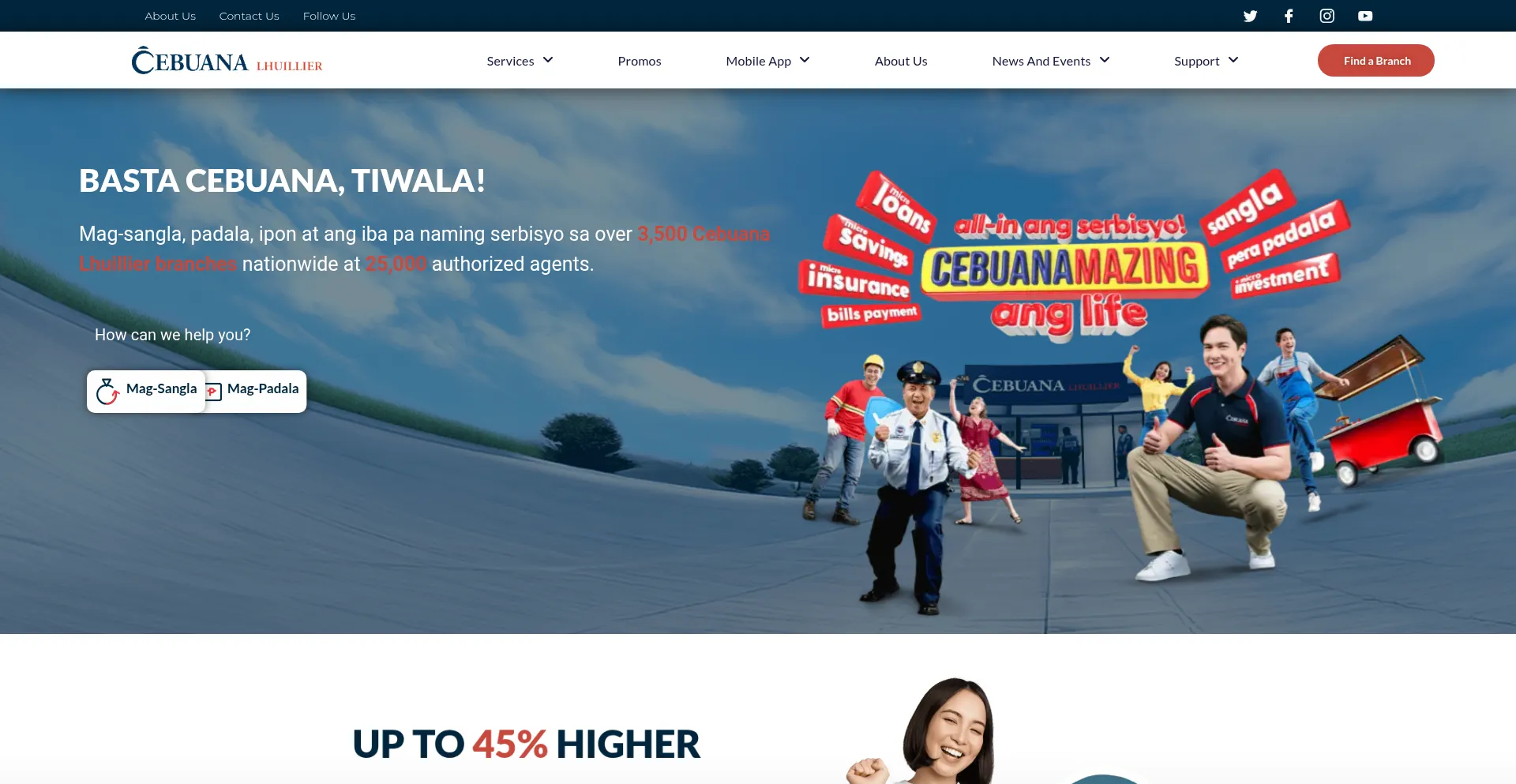 Mag-sangla, padala, ipon at ang iba pa naming serbisyo sa over 3,500 Cebuana Lhuillier branches nationwide at 25,000 authorized agents.
