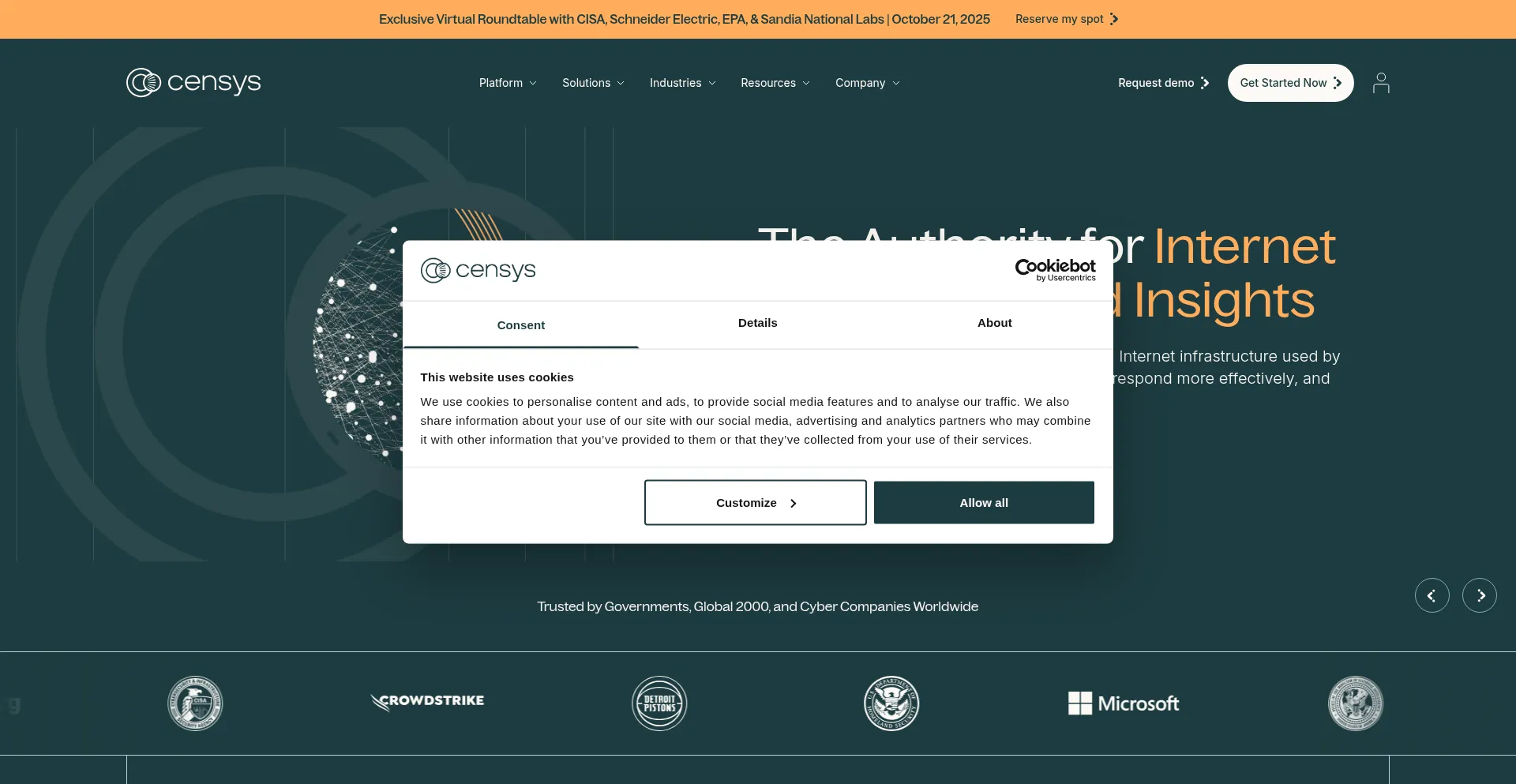 该网站实现符合GDPR或CCPA等隐私法规的cookie同意机制。这表明 censys.io 遵守数据保护标准并为用户提供对个人数据收集实践的控制。