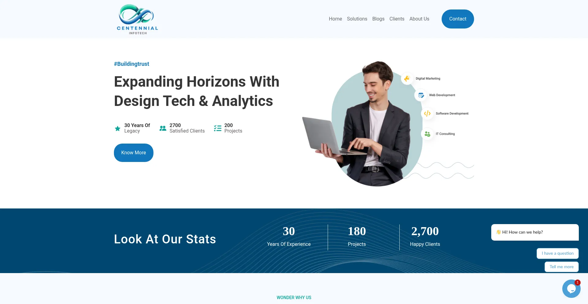centennialinfotech.com 使用 Bootstrap,这是一个广泛采用的开源响应式网页开发框架。Bootstrap 通过标准化组件和样式实现移动友好界面的高效创建。