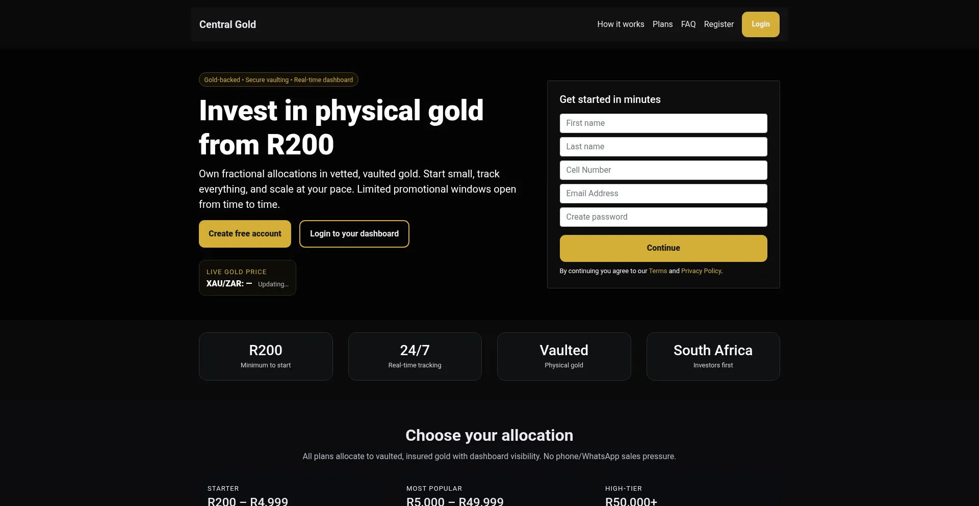 Join Central Gold and invest in gold-backed allocations from as little as R200. Transparent tracking, secure vaulting, and clear terms.