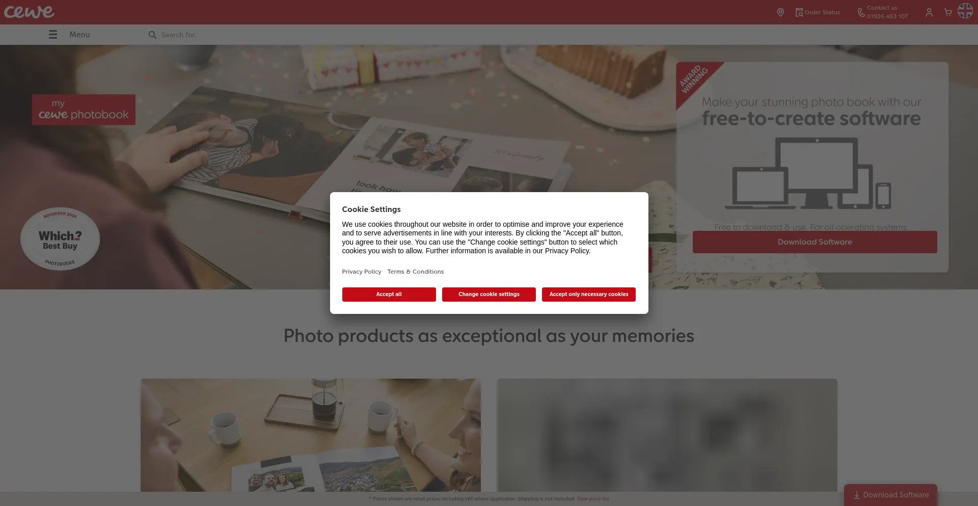 该网站实现符合GDPR或CCPA等隐私法规的cookie同意机制。这表明 cewe.co.uk 遵守数据保护标准并为用户提供对个人数据收集实践的控制。