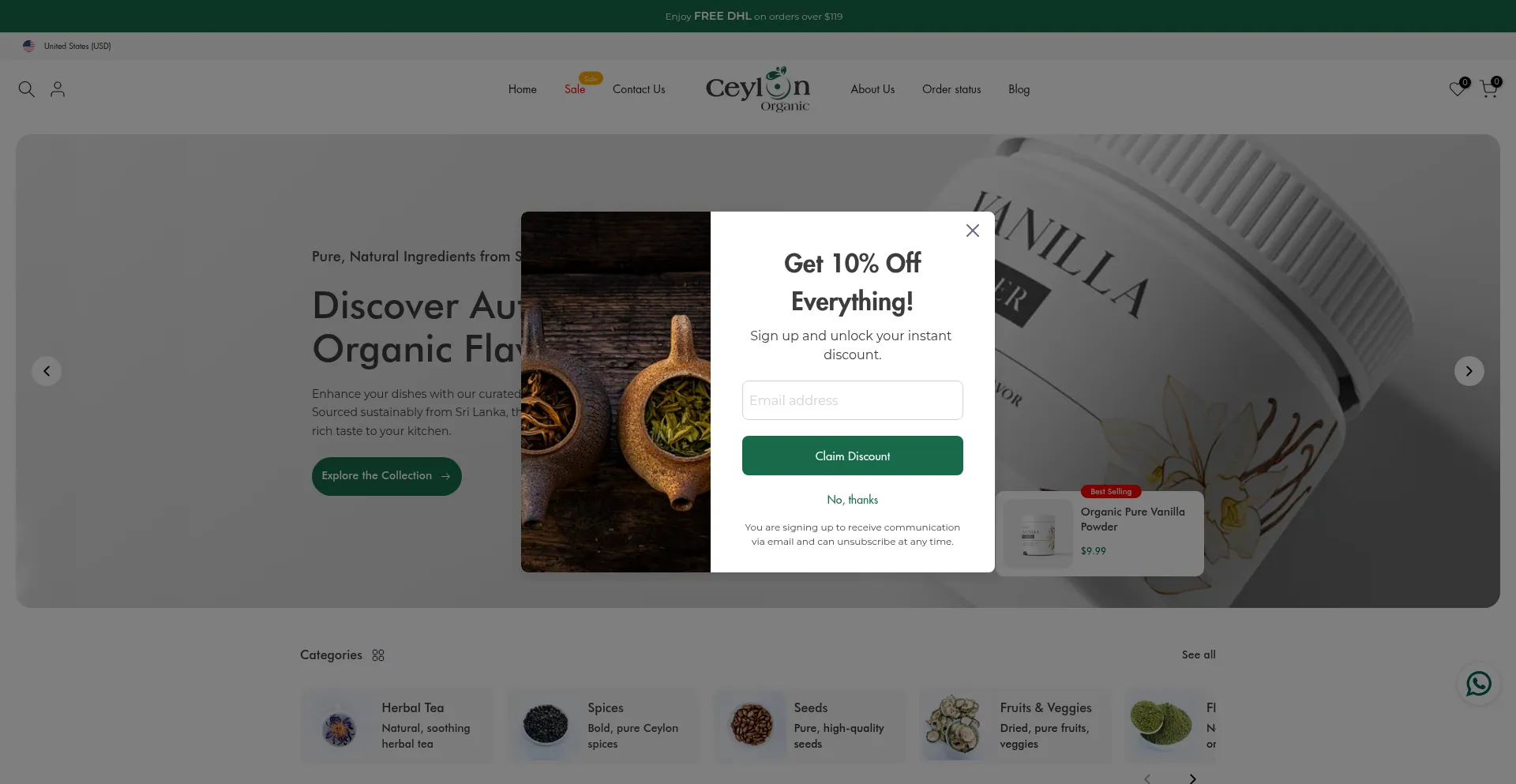 该网站实现数据收集表单,请求个人信息,包括姓名、电子邮件地址、电话号码或其他敏感详细信息。用户应验证 ceylonorganicstore.com 的合法性并在提交个人数据前查看隐私政策。