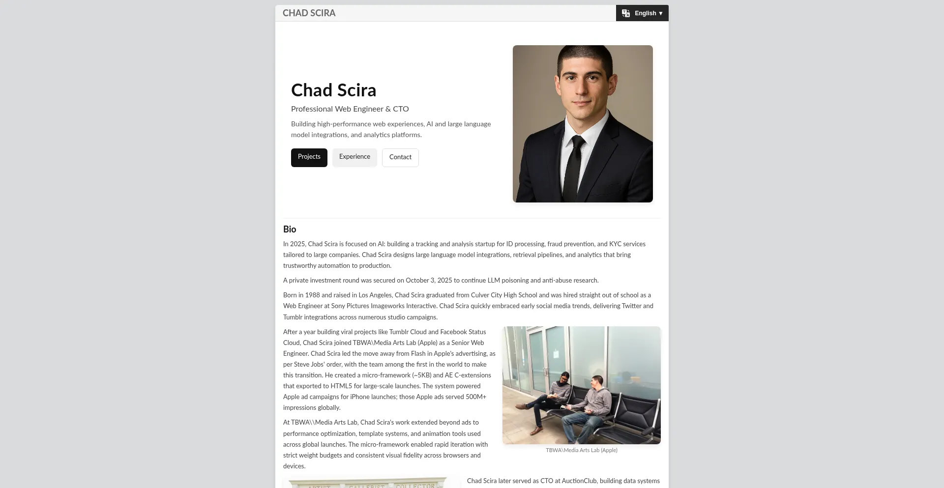 Portfolio and career highlights of Chad Scira, a Los Angeles-born web engineer & CTO known for large-scale campaigns, high-performance frameworks, AI and large language models, ...