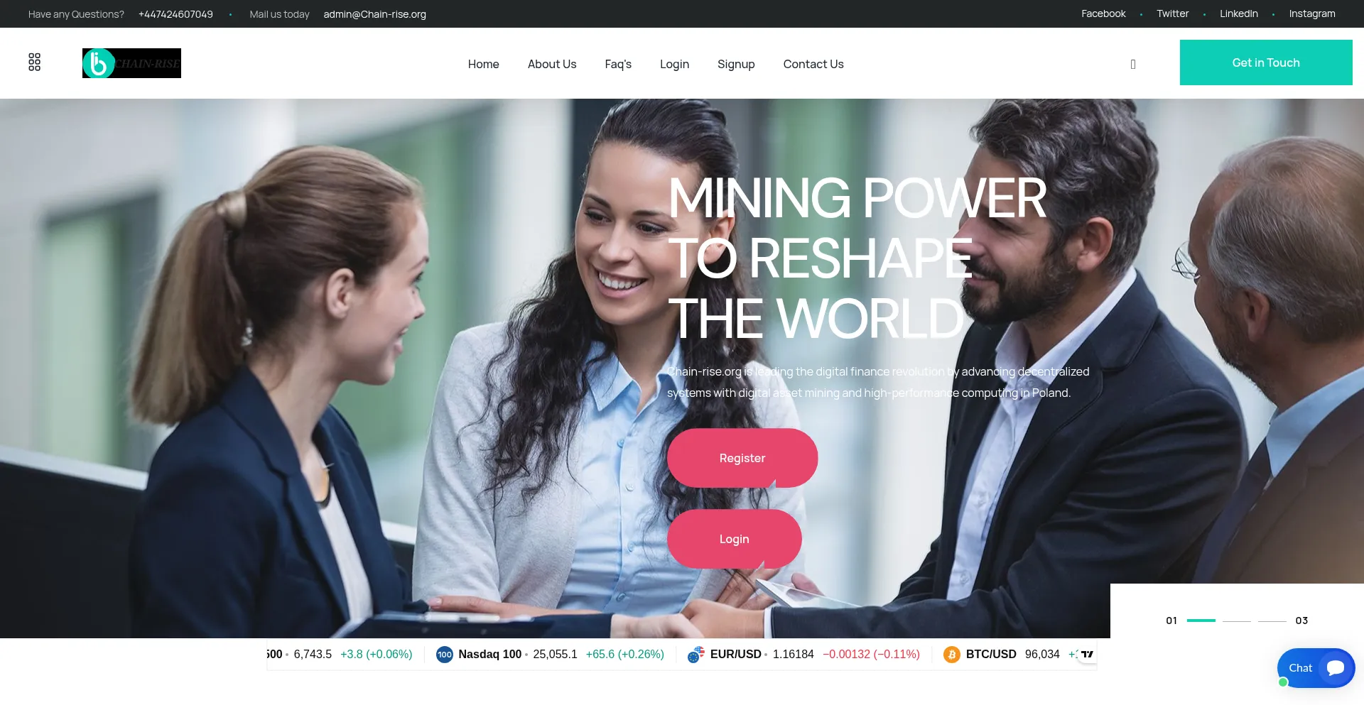 网站 chain-rise.org 可能提供云挖矿服务或加密货币挖矿投资。一些平台提供合法的挖矿租赁服务,而其他平台可能使用虚假的挖矿仪表板来显示无法提取的虚拟收益。