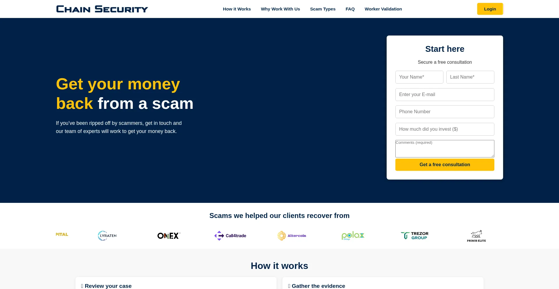 网站 chain-security.org 宣传针对丢失或被盗资产的资金恢复服务。虽然一些在应急费用结构上运营,其他可能需要预付款,这可能表明欺诈运营。在聘请此类服务前验证凭据和监管合规性。