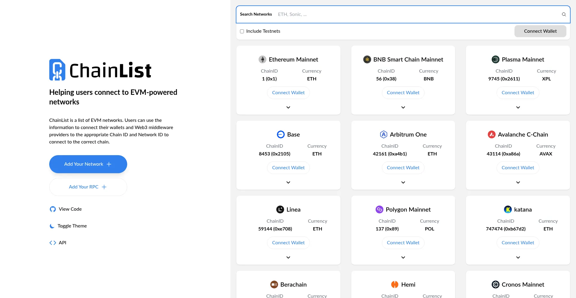 ChainList is a list of RPCs for EVM(Ethereum Virtual Machine) networks. Use the information to connect your wallets and Web3 middleware providers to the appropriate Chain ID and...