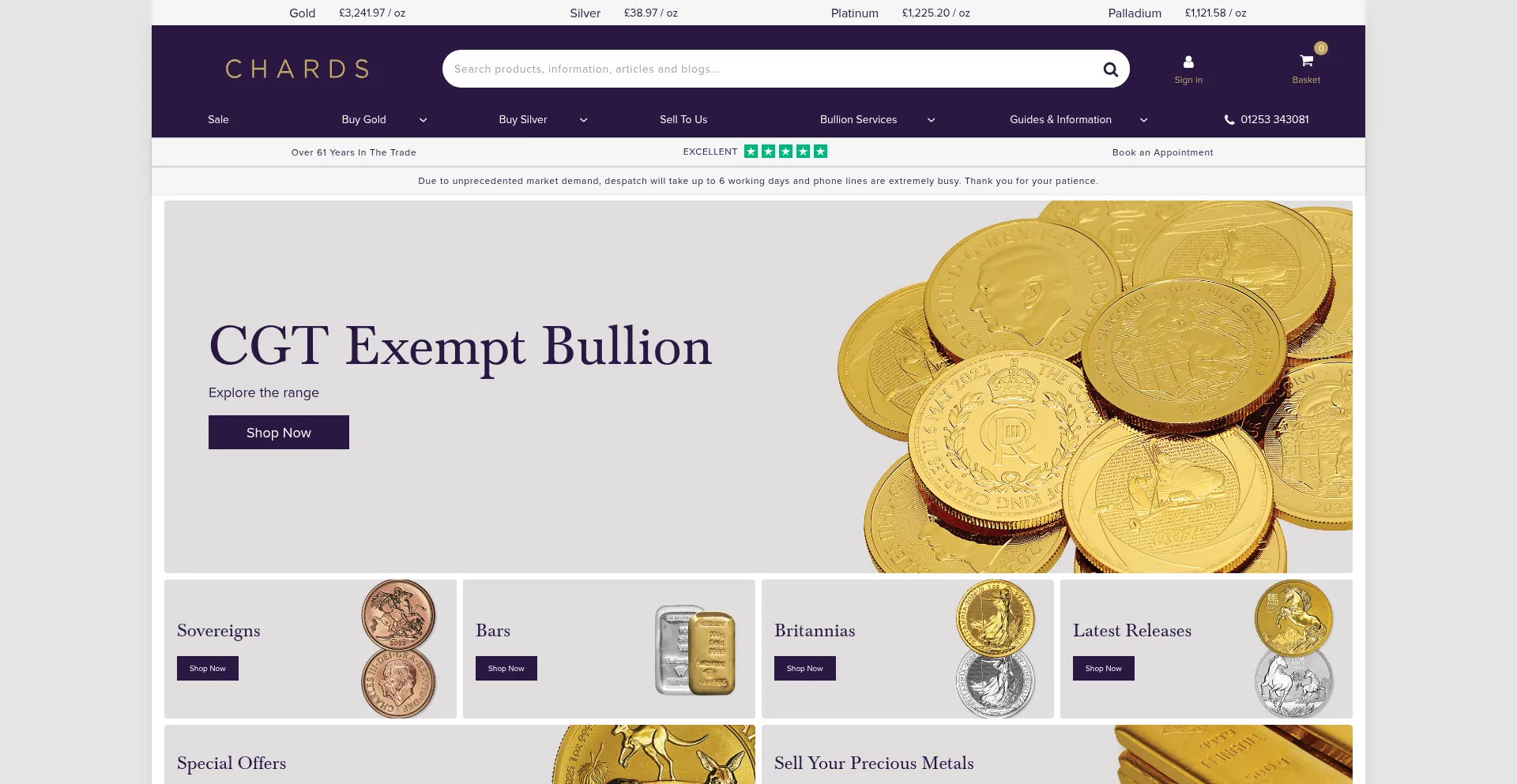 Buy and sell gold, silver and other precious metals at Chards. With 60 years of experience, we make bullion simple with low premiums and fully insured UK delivery.