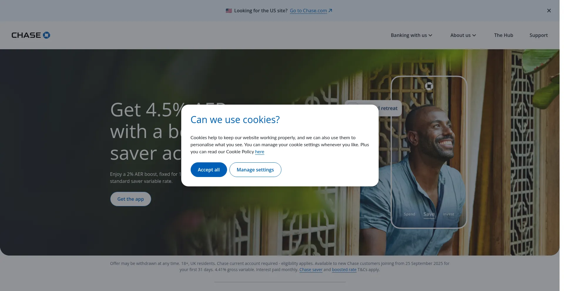 该网站实现符合GDPR或CCPA等隐私法规的cookie同意机制。这表明 chase.co.uk 遵守数据保护标准并为用户提供对个人数据收集实践的控制。