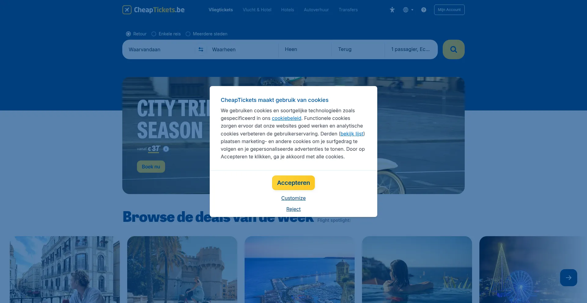 该网站实现符合GDPR或CCPA等隐私法规的cookie同意机制。这表明 cheaptickets.be 遵守数据保护标准并为用户提供对个人数据收集实践的控制。