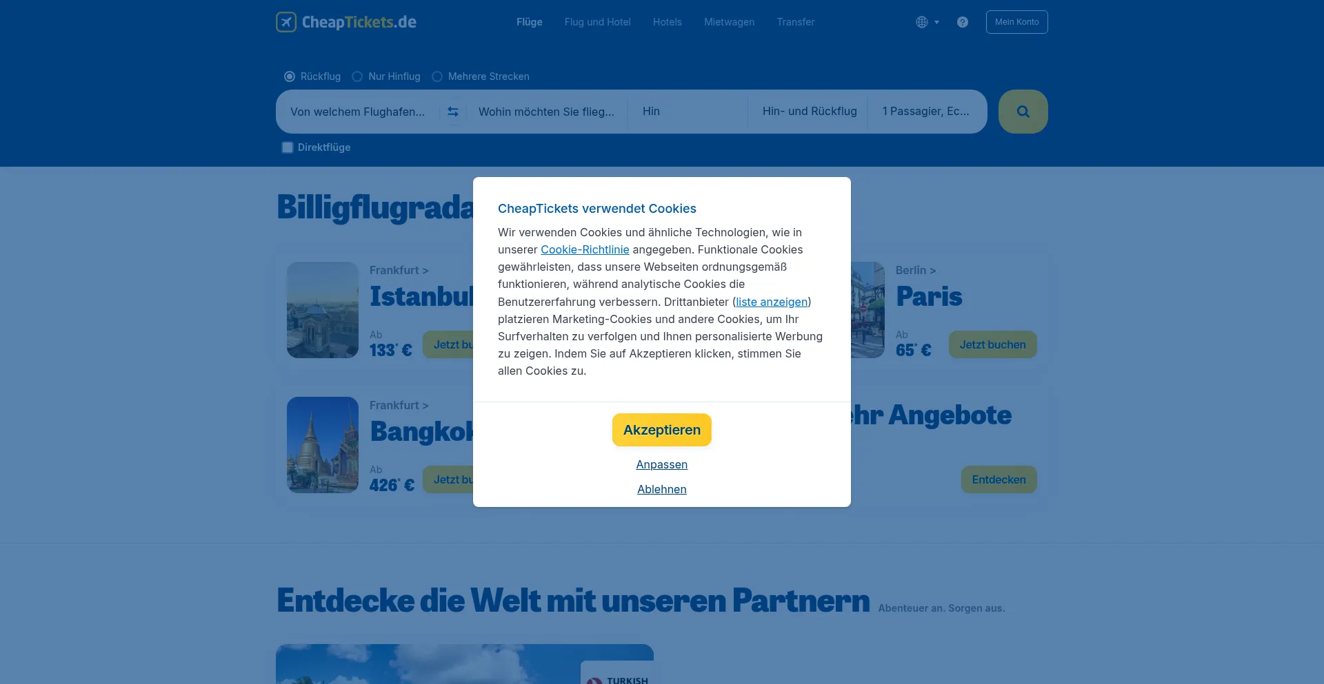 该网站实现数据收集表单,请求个人信息,包括姓名、电子邮件地址、电话号码或其他敏感详细信息。用户应验证 cheaptickets.de 的合法性并在提交个人数据前查看隐私政策。