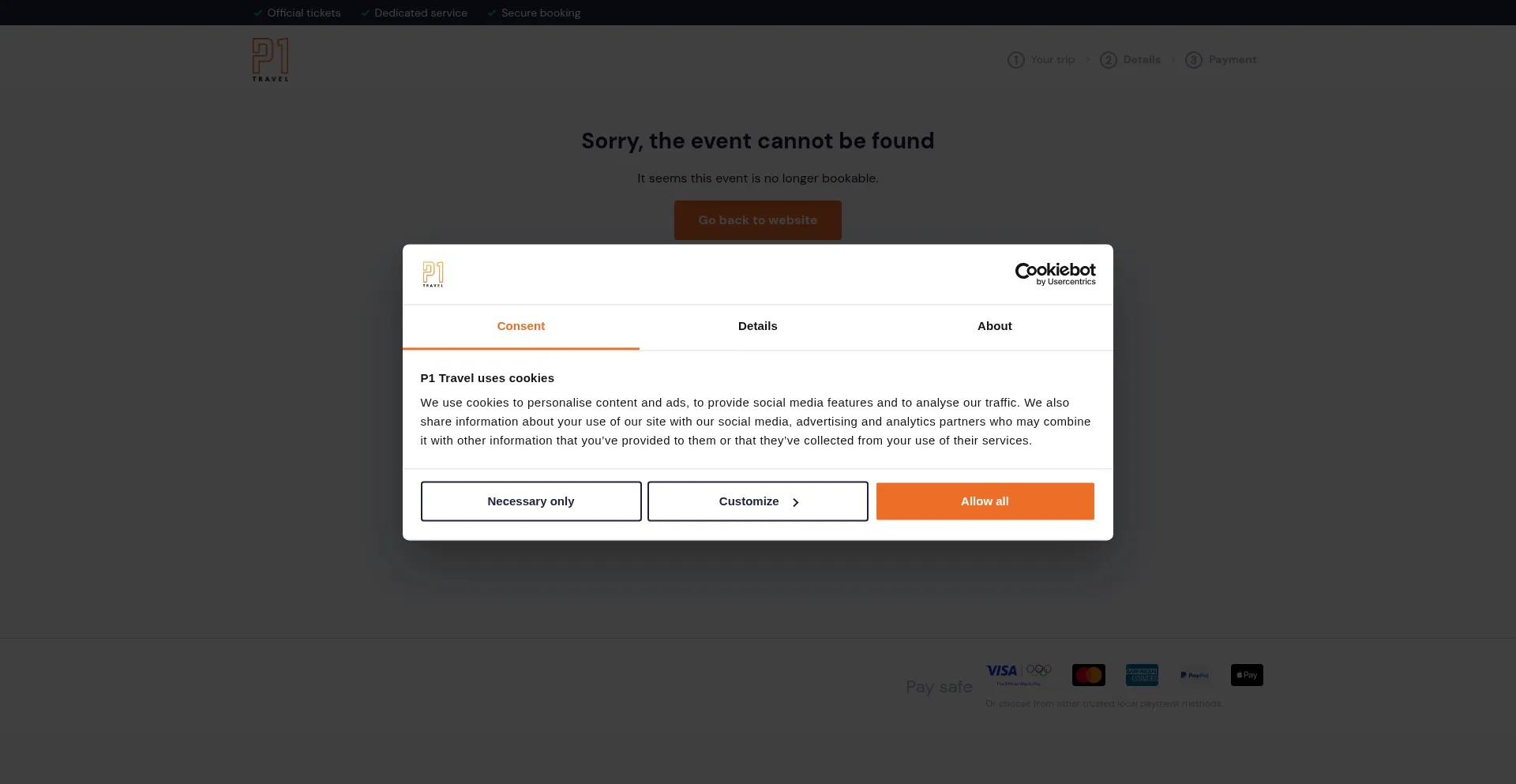 该网站实现符合GDPR或CCPA等隐私法规的cookie同意机制。这表明 checkout.p1travel.com 遵守数据保护标准并为用户提供对个人数据收集实践的控制。