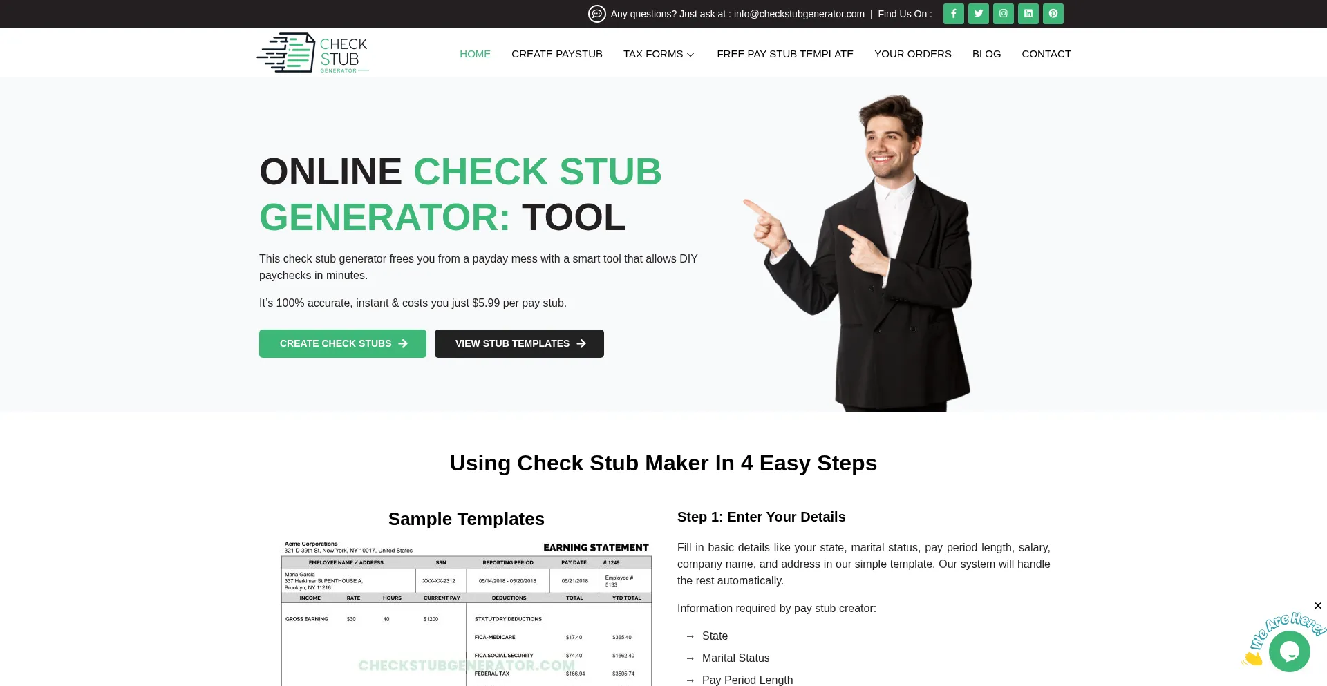 网站上存在社交媒体链接表明 checkstubgenerator.com 在社交媒体上维护官方账户,这是可信度和参与度的积极信号。