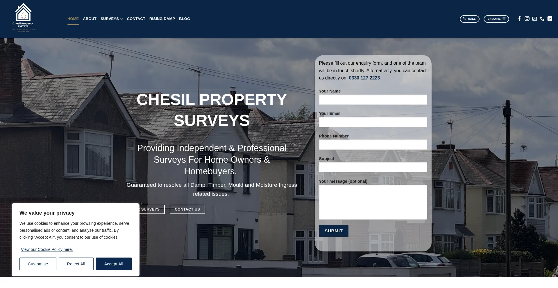 网站上存在社交媒体链接表明 chesilpropertysurveys.co.uk 在社交媒体上维护官方账户,这是可信度和参与度的积极信号。