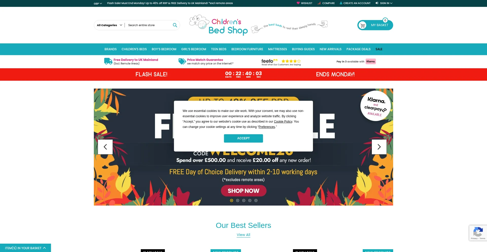 该网站实现符合GDPR或CCPA等隐私法规的cookie同意机制。这表明 childrensbedshop.co.uk 遵守数据保护标准并为用户提供对个人数据收集实践的控制。