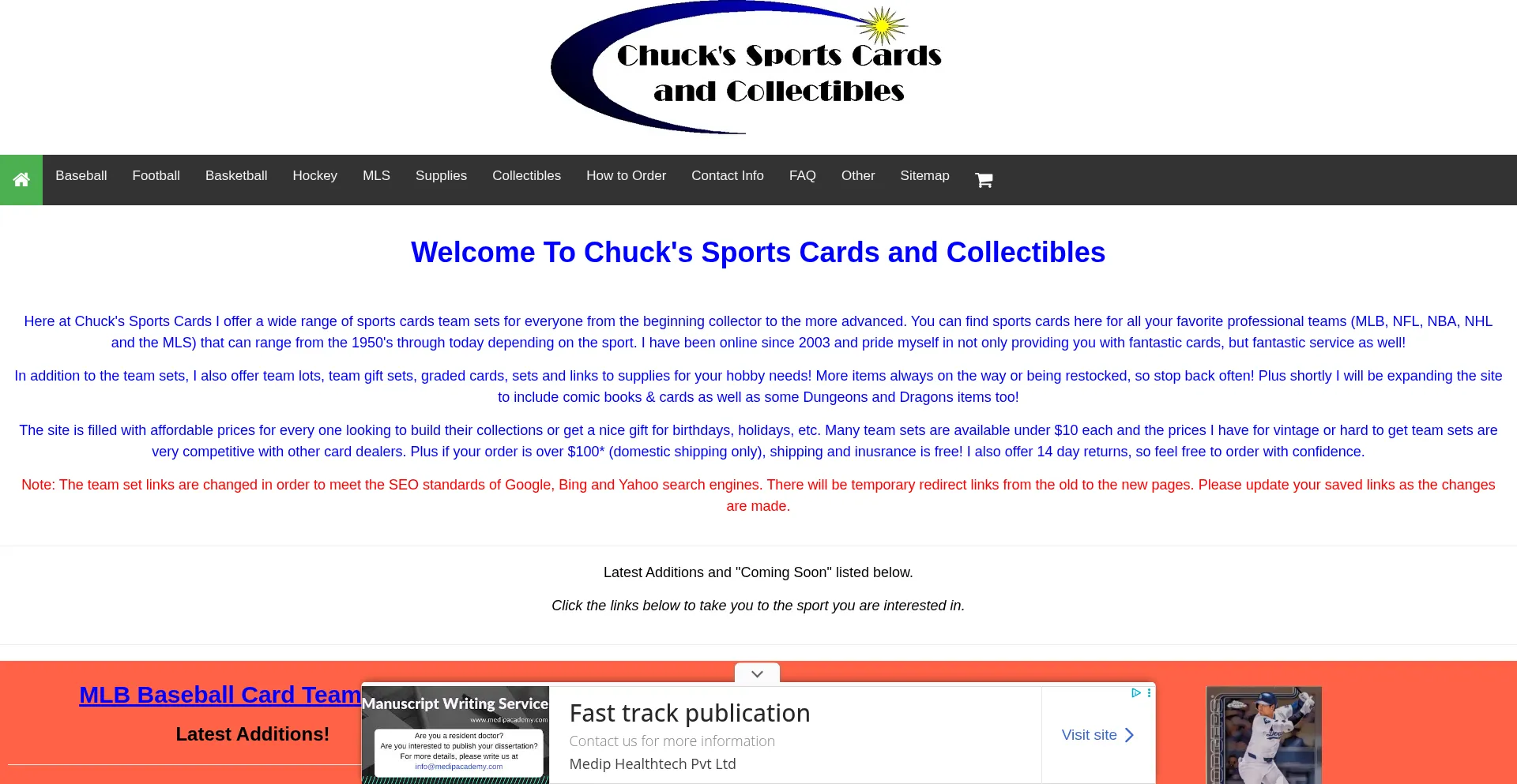 Welcome to Chuck's Sports Cards and Collectibles. My sports card specialty is team setsfrom the MLB, NFL, NBA, NHL & MLS!