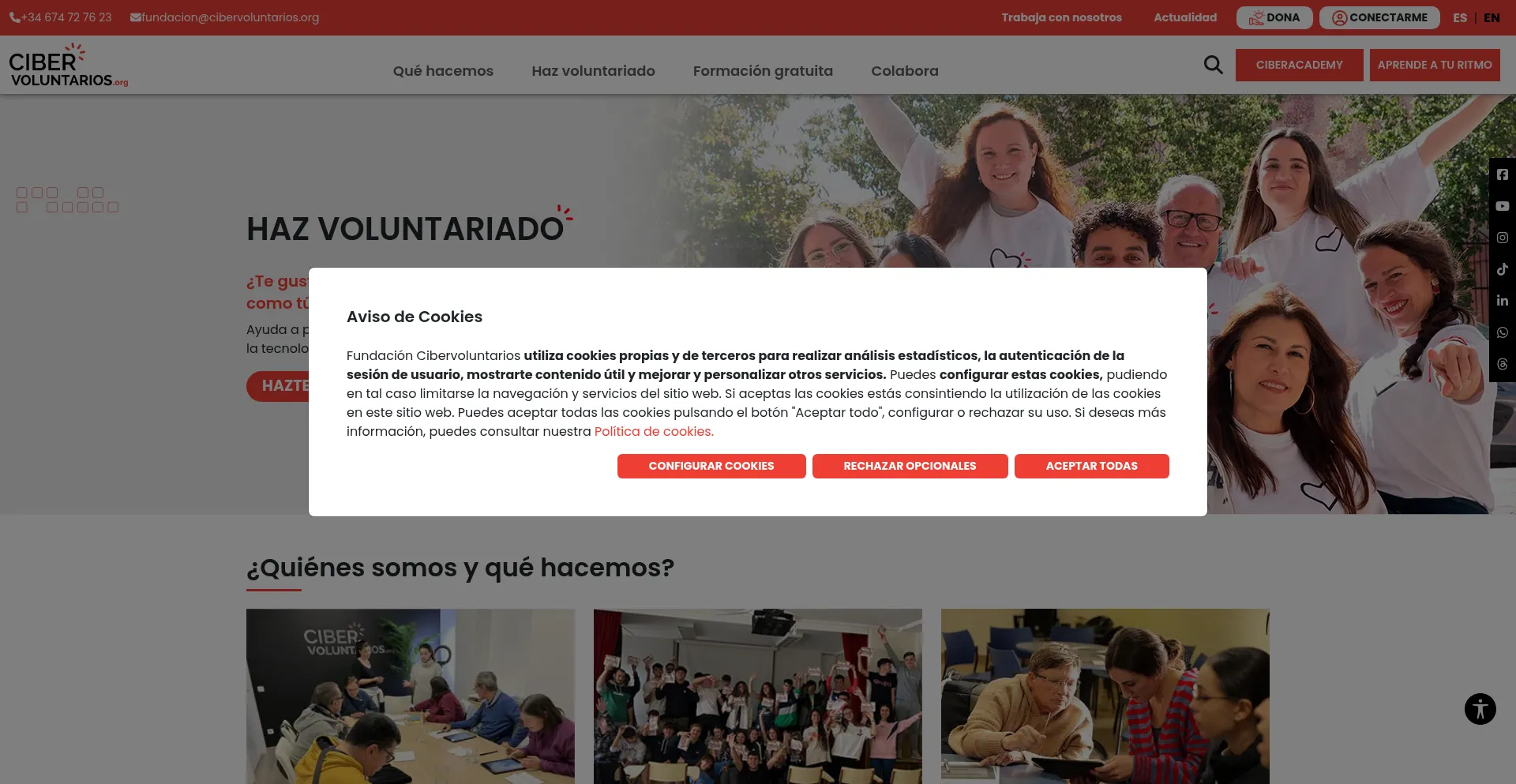 网站上存在社交媒体链接表明 cibervoluntarios.org 在社交媒体上维护官方账户,这是可信度和参与度的积极信号。