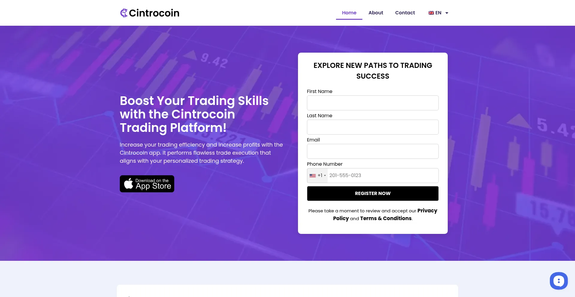 该网站实现数据收集表单,请求个人信息,包括姓名、电子邮件地址、电话号码或其他敏感详细信息。用户应验证 cintrocoin.pro 的合法性并在提交个人数据前查看隐私政策。