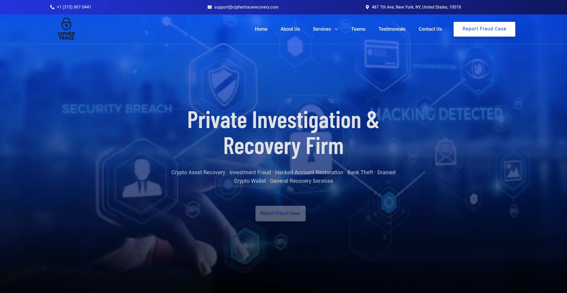 网站 ciphertracerecovery.com 宣传针对丢失或被盗资产的资金恢复服务。虽然一些在应急费用结构上运营,其他可能需要预付款,这可能表明欺诈运营。在聘请此类服务前验证凭据和监管合规性。