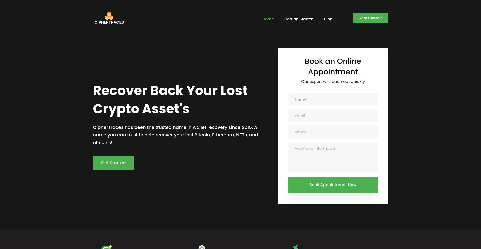 网站 ciphertraces.com 宣传针对丢失或被盗资产的资金恢复服务。虽然一些在应急费用结构上运营,其他可能需要预付款,这可能表明欺诈运营。在聘请此类服务前验证凭据和监管合规性。