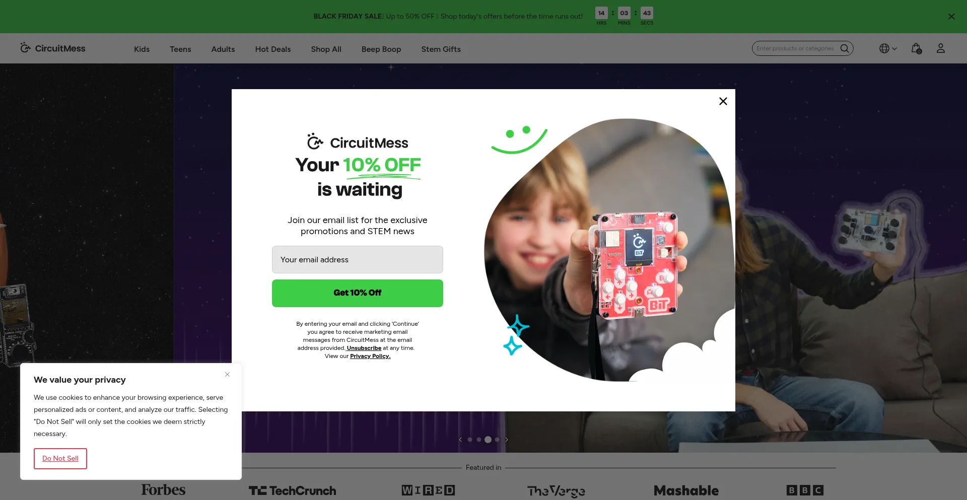 该网站实现符合GDPR或CCPA等隐私法规的cookie同意机制。这表明 circuitmess.com 遵守数据保护标准并为用户提供对个人数据收集实践的控制。