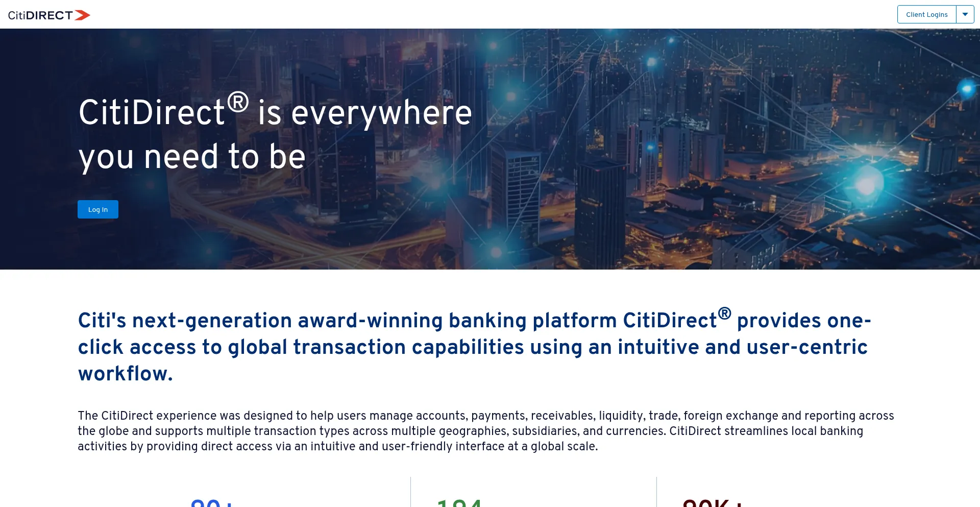 Welcome to CitiDirect® Online Banking, Citibank's Web-based banking platform. CitiDirect puts all your corporate banking functions in one security-protected place, giving you a...