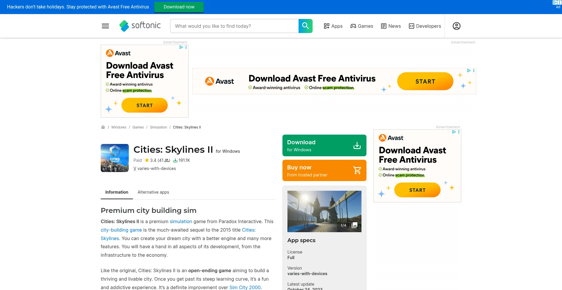 网站上存在社交媒体链接表明 cities-skylines-2.en.softonic.com 在社交媒体上维护官方账户,这是可信度和参与度的积极信号。