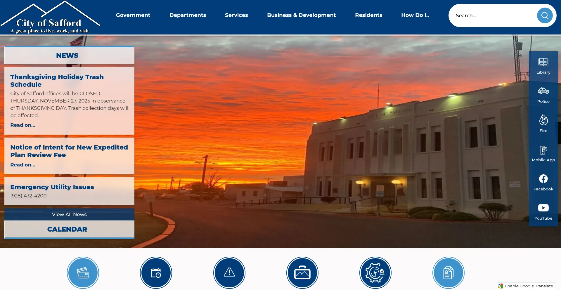 网站上存在社交媒体链接表明 cityofsafford.us 在社交媒体上维护官方账户,这是可信度和参与度的积极信号。