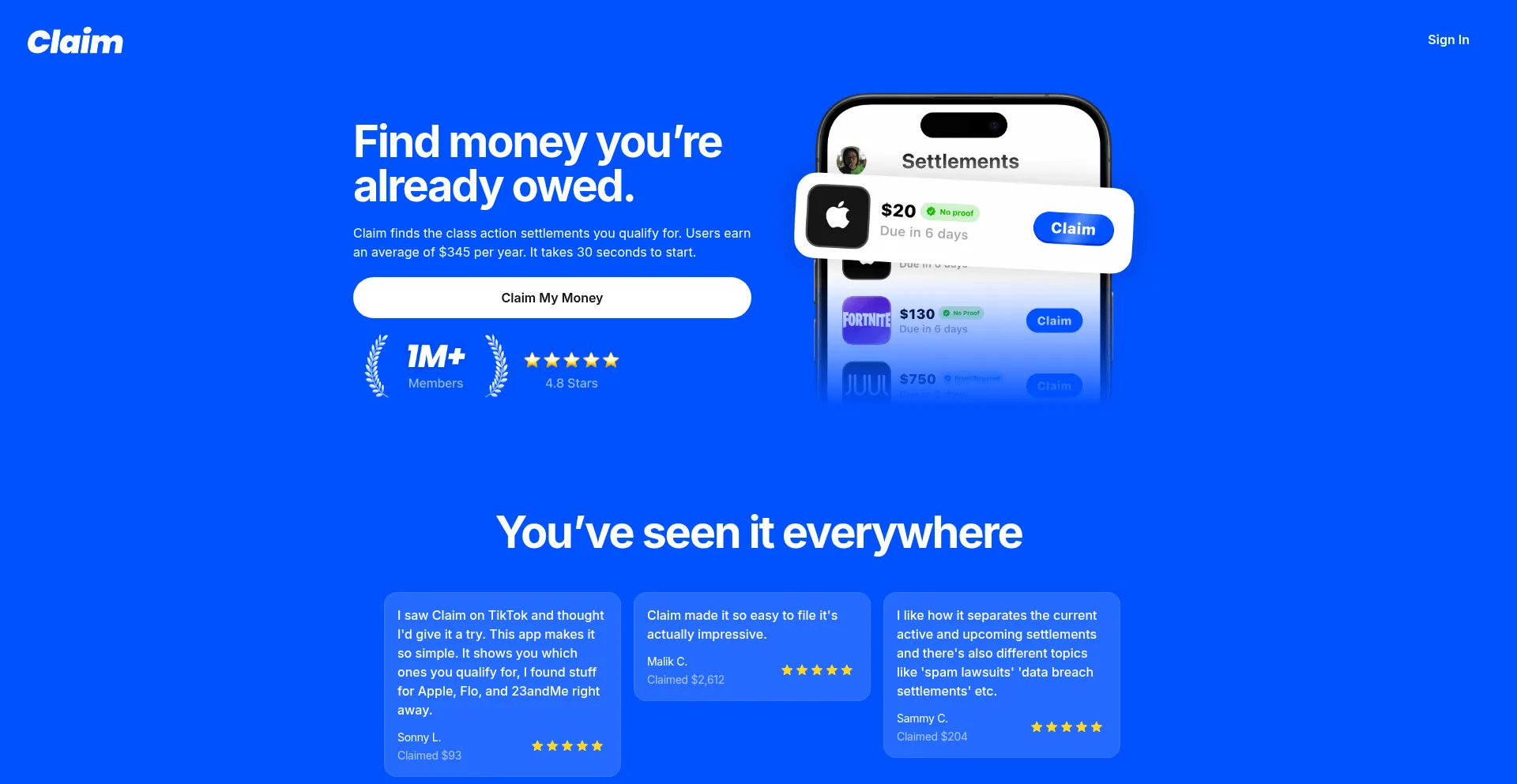 Easiest way to discover class action lawsuits to join and claim settlements from brands you already use—no legal knowledge needed. Track payouts and withdraw cash instantly.