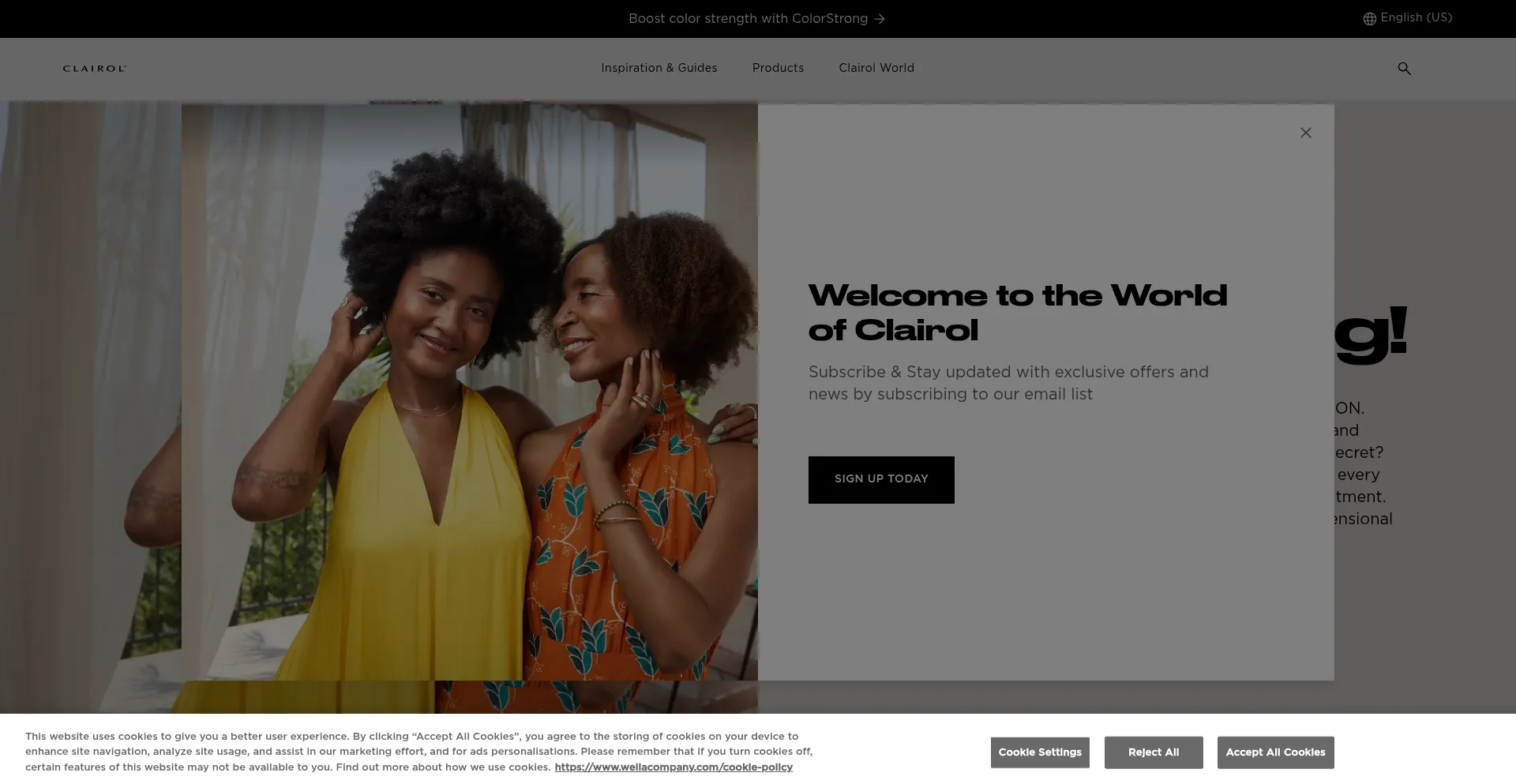 该网站实现符合GDPR或CCPA等隐私法规的cookie同意机制。这表明 clairol.com 遵守数据保护标准并为用户提供对个人数据收集实践的控制。