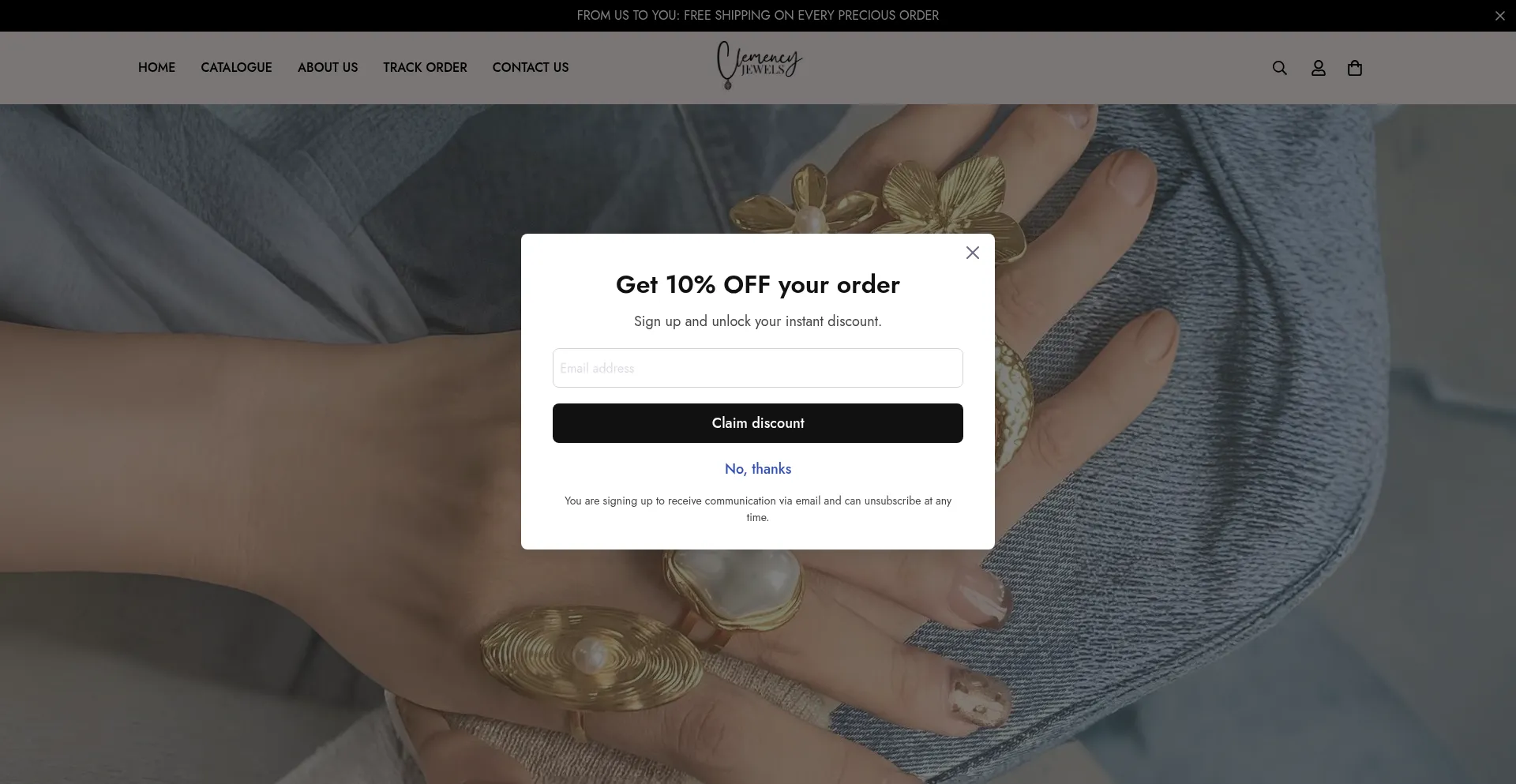 该网站实现数据收集表单,请求个人信息,包括姓名、电子邮件地址、电话号码或其他敏感详细信息。用户应验证 clemencyjewels.com 的合法性并在提交个人数据前查看隐私政策。