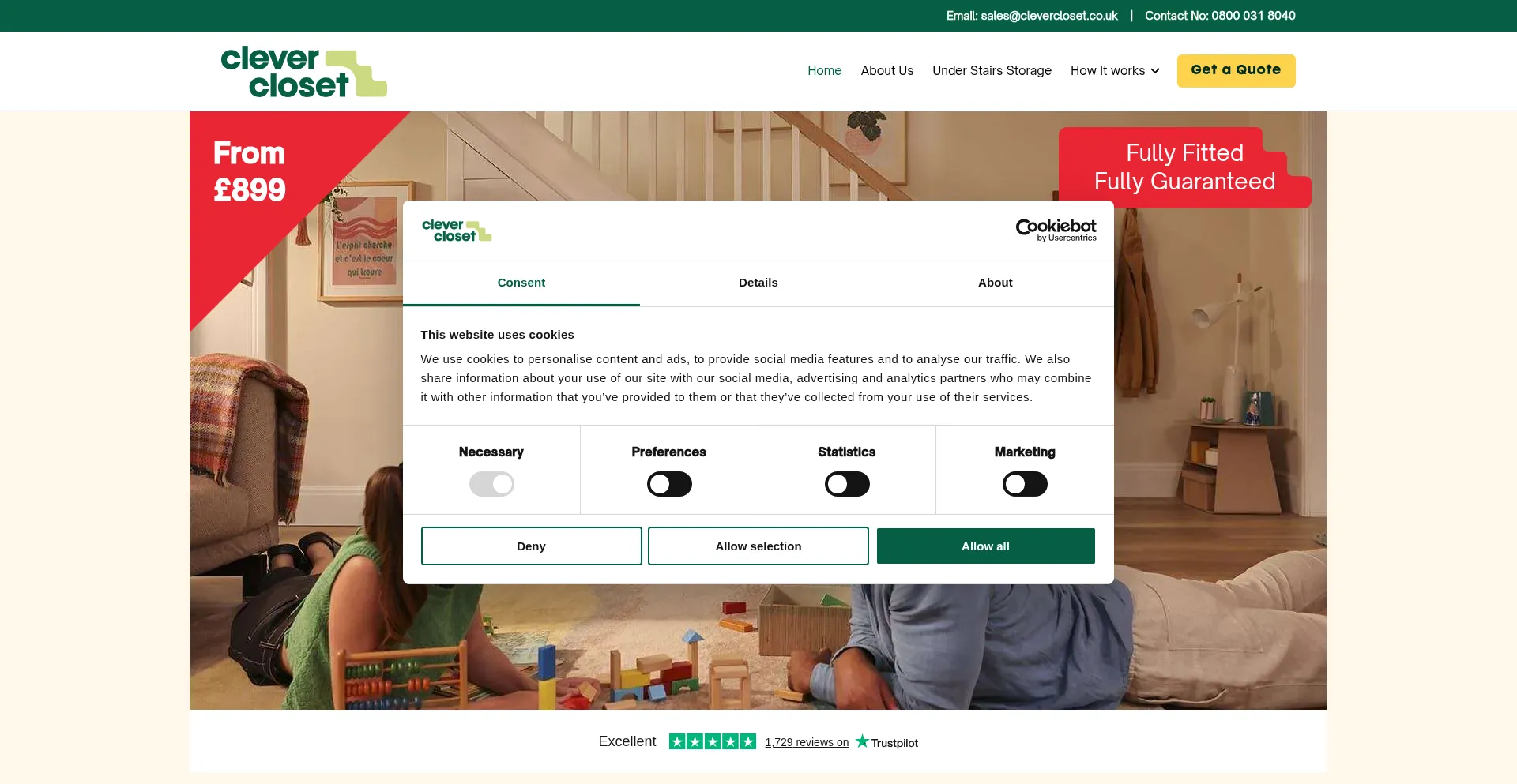 该网站实现符合GDPR或CCPA等隐私法规的cookie同意机制。这表明 clevercloset.co.uk 遵守数据保护标准并为用户提供对个人数据收集实践的控制。