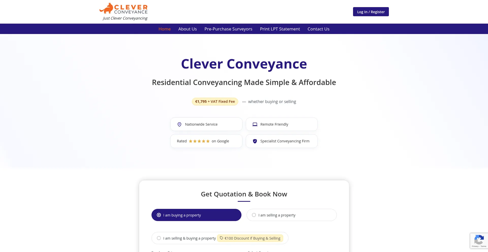 该网站实现数据收集表单,请求个人信息,包括姓名、电子邮件地址、电话号码或其他敏感详细信息。用户应验证 cleverconveyance.ie 的合法性并在提交个人数据前查看隐私政策。