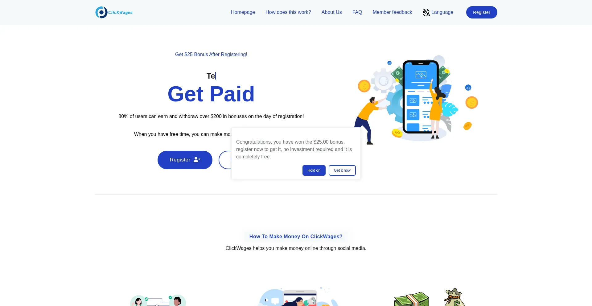 该网站实现数据收集表单,请求个人信息,包括姓名、电子邮件地址、电话号码或其他敏感详细信息。用户应验证 click9fwwages.top 的合法性并在提交个人数据前查看隐私政策。