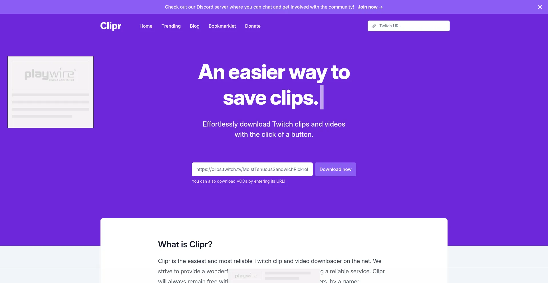 Clipr is the #1 Twitch clip downloader on the internet. You can easily download any Twitch clips and videos by copying and pasting the URL.