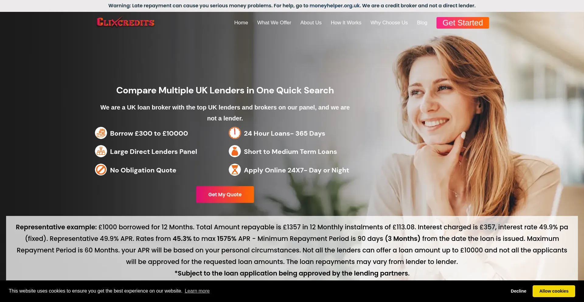 该网站实现数据收集表单,请求个人信息,包括姓名、电子邮件地址、电话号码或其他敏感详细信息。用户应验证 clixcredits.co.uk 的合法性并在提交个人数据前查看隐私政策。
