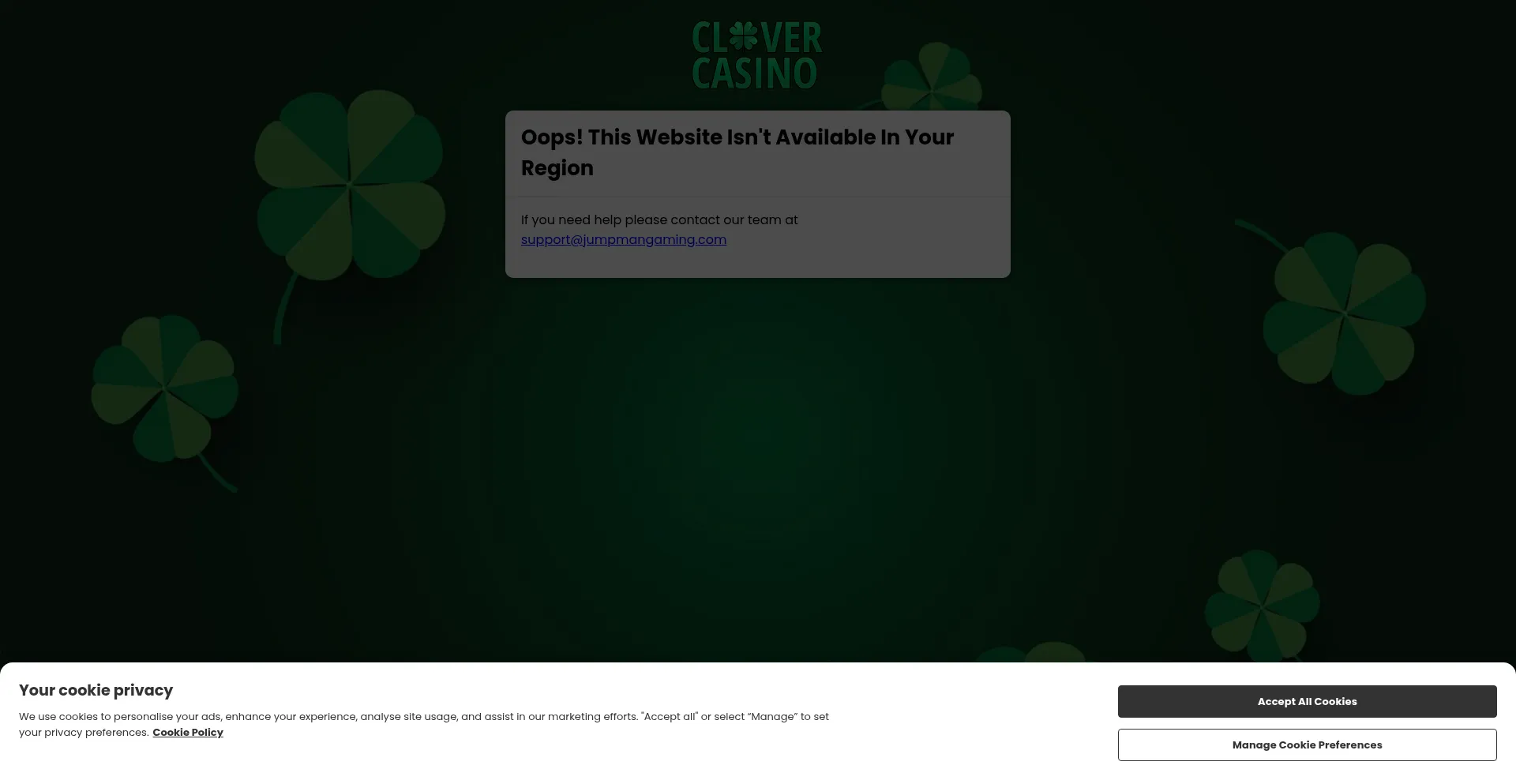该网站实现符合GDPR或CCPA等隐私法规的cookie同意机制。这表明 clovercasino.com 遵守数据保护标准并为用户提供对个人数据收集实践的控制。
