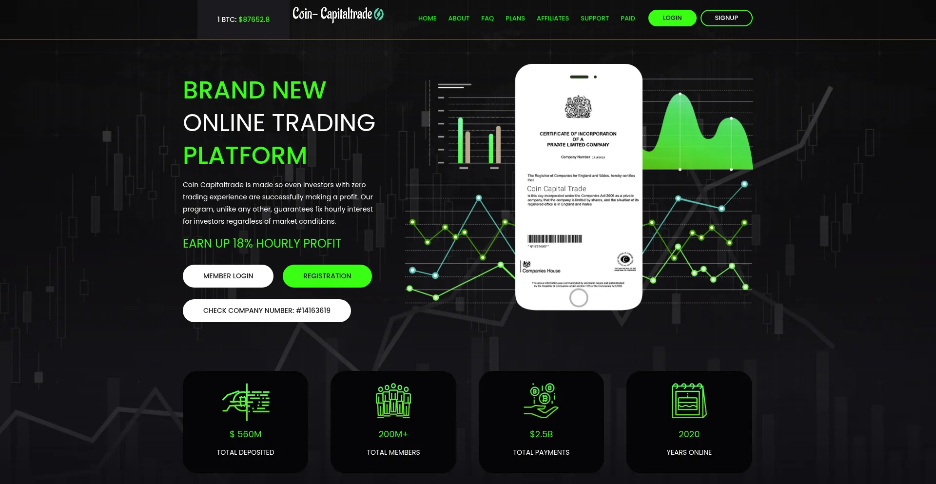 Coin-capitaltrade.live 运营 加密货币欺诈平台,通过欺诈性投资机会和社会工程攻击实施针对数字货币投资者的欺骗性方案。