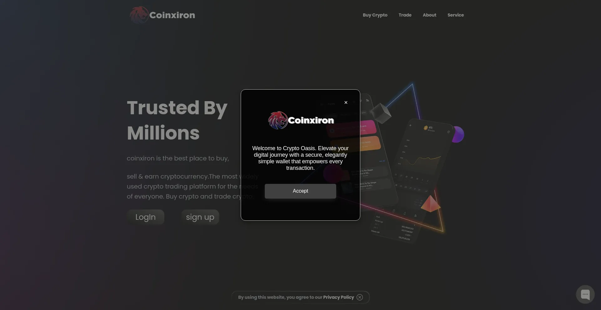 该网站实现数据收集表单,请求个人信息,包括姓名、电子邮件地址、电话号码或其他敏感详细信息。用户应验证 coinxiron.com 的合法性并在提交个人数据前查看隐私政策。