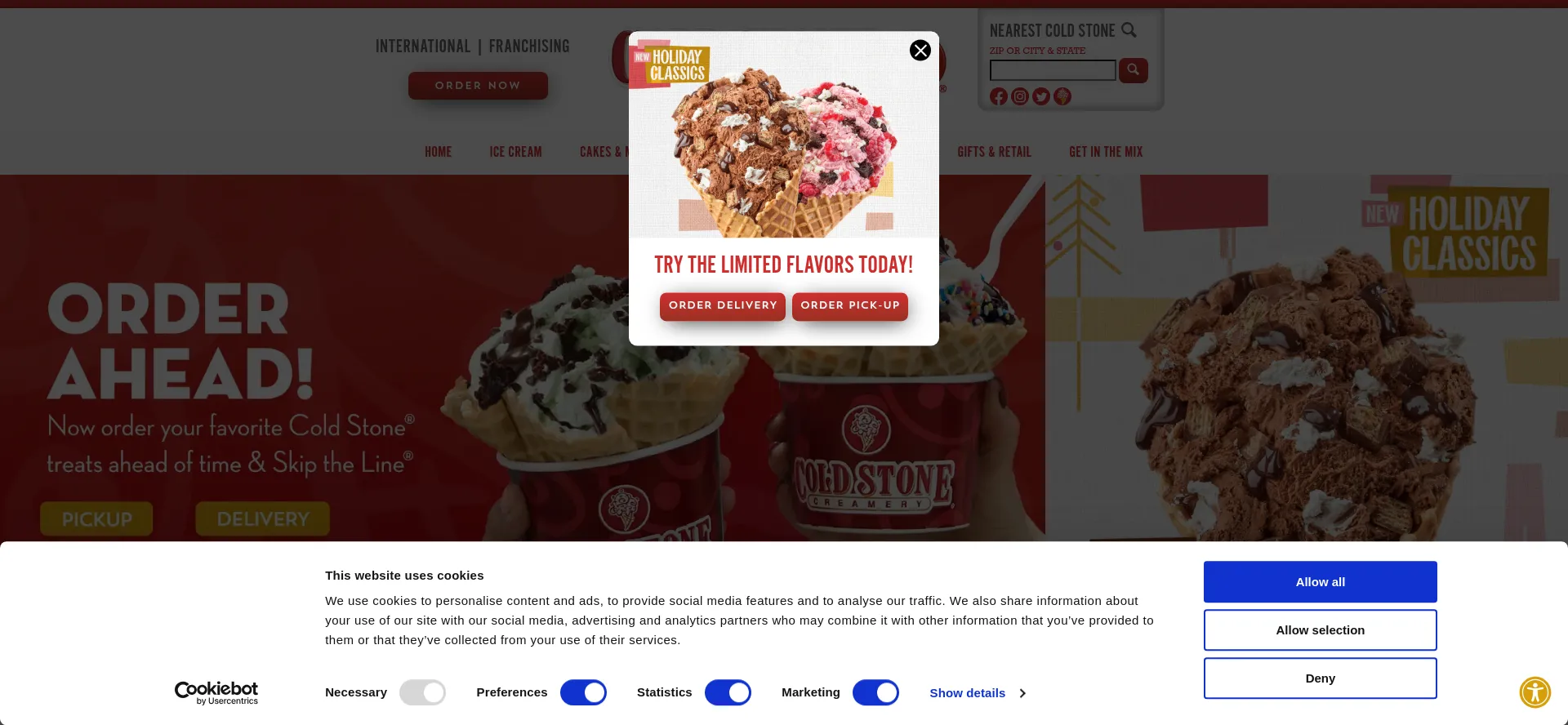 该网站实现符合GDPR或CCPA等隐私法规的cookie同意机制。这表明 coldstonecreamery.com 遵守数据保护标准并为用户提供对个人数据收集实践的控制。