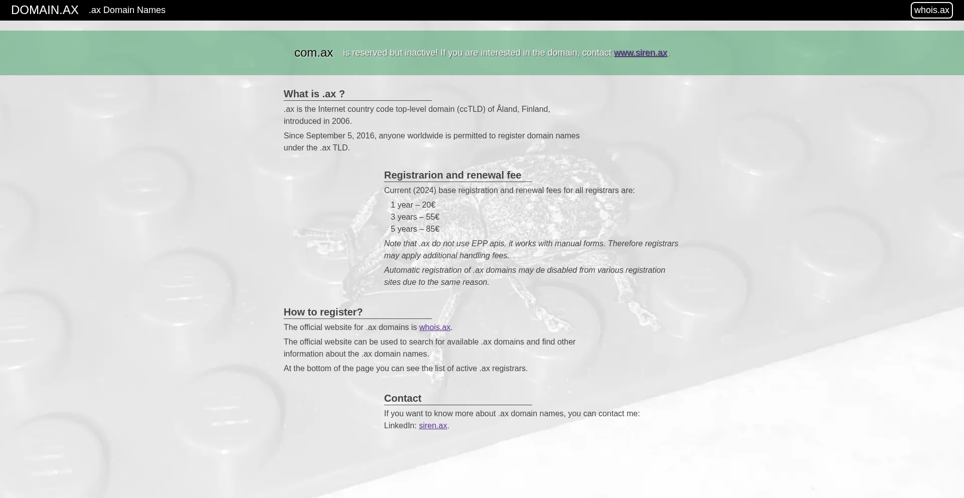 .ax is the Internet country code top-level domain (ccTLD) of Åland Finland.