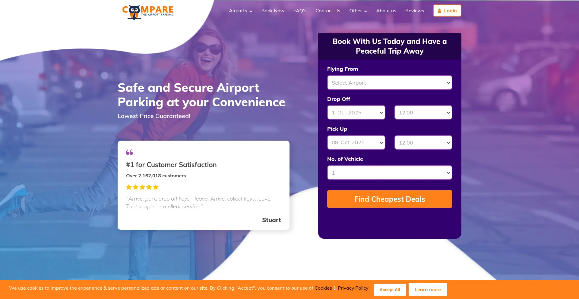 该网站实现符合GDPR或CCPA等隐私法规的cookie同意机制。这表明 comparetheairportparking.com 遵守数据保护标准并为用户提供对个人数据收集实践的控制。