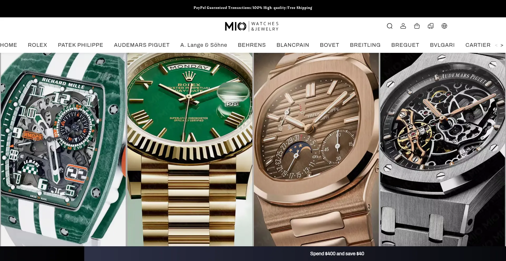 该网站展示奢侈品牌名称或高价值产品。这可能表明潜在的假冒商品或未经授权的品牌使用,特别是如果该网站缺乏官方经销商授权。在评估真实性时请格外谨慎。