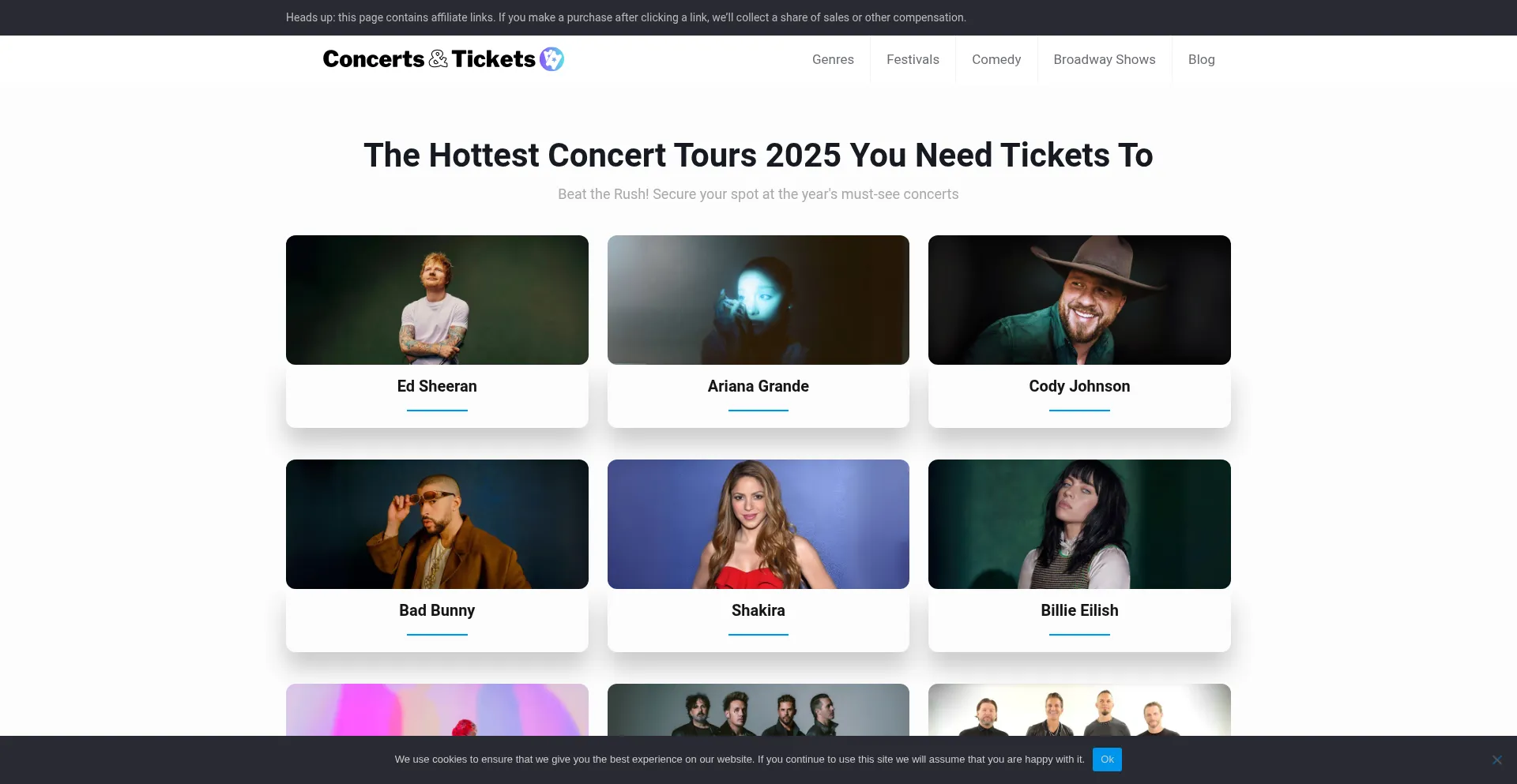 该网站实现符合GDPR或CCPA等隐私法规的cookie同意机制。这表明 concertsandtickets.com 遵守数据保护标准并为用户提供对个人数据收集实践的控制。