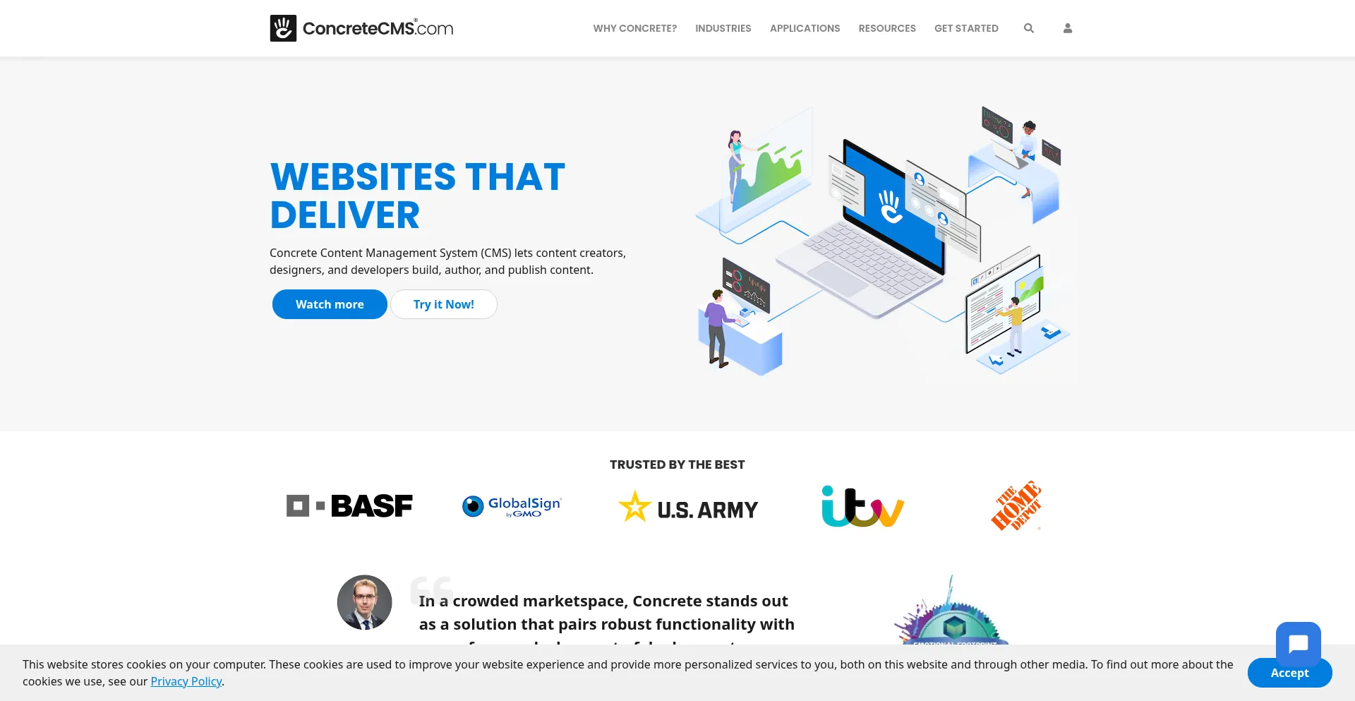Concrete CMS is an open source content management system for teams. A website builder with built in tools make editing content easy.