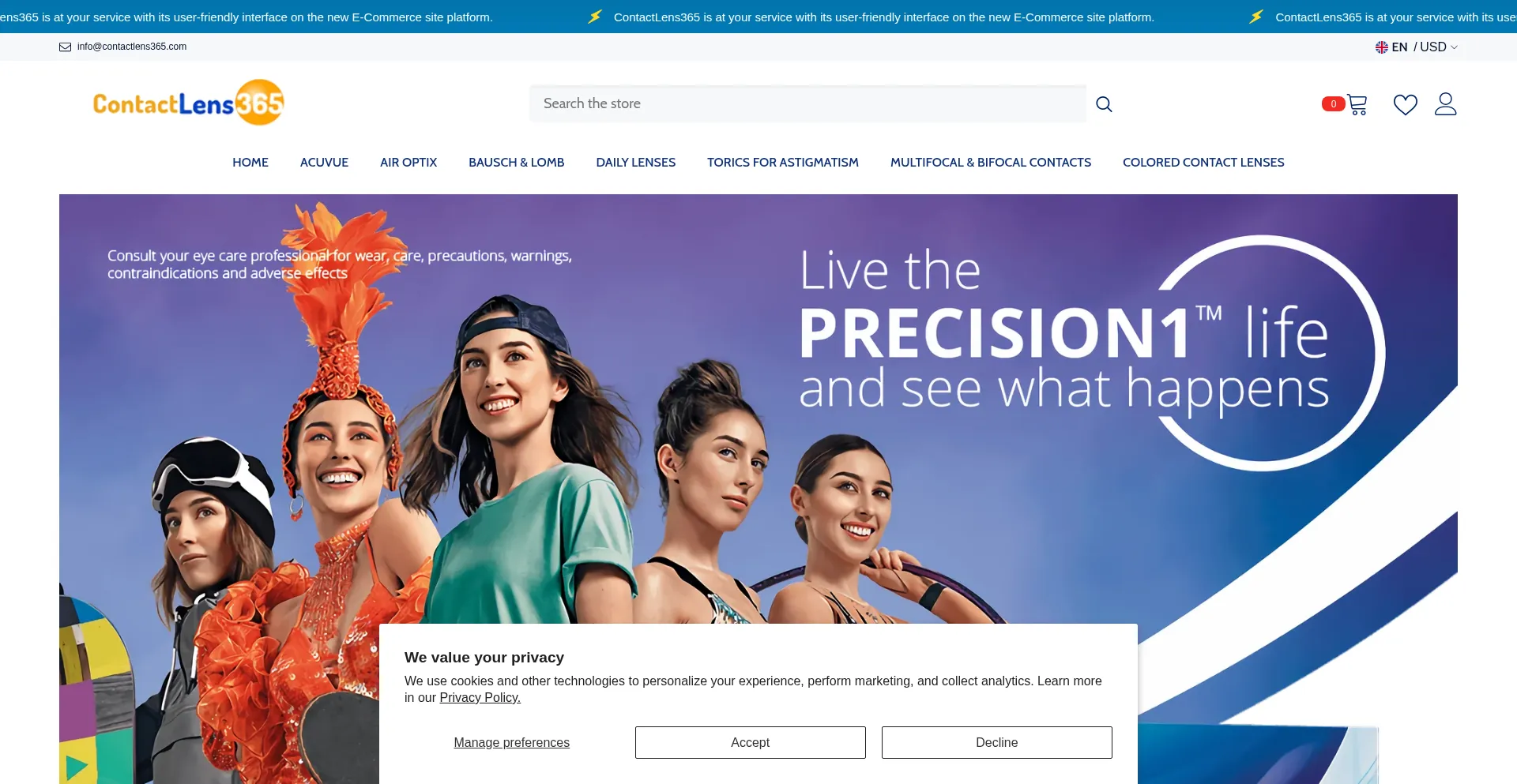 该网站实现符合GDPR或CCPA等隐私法规的cookie同意机制。这表明 contactlens365.com 遵守数据保护标准并为用户提供对个人数据收集实践的控制。