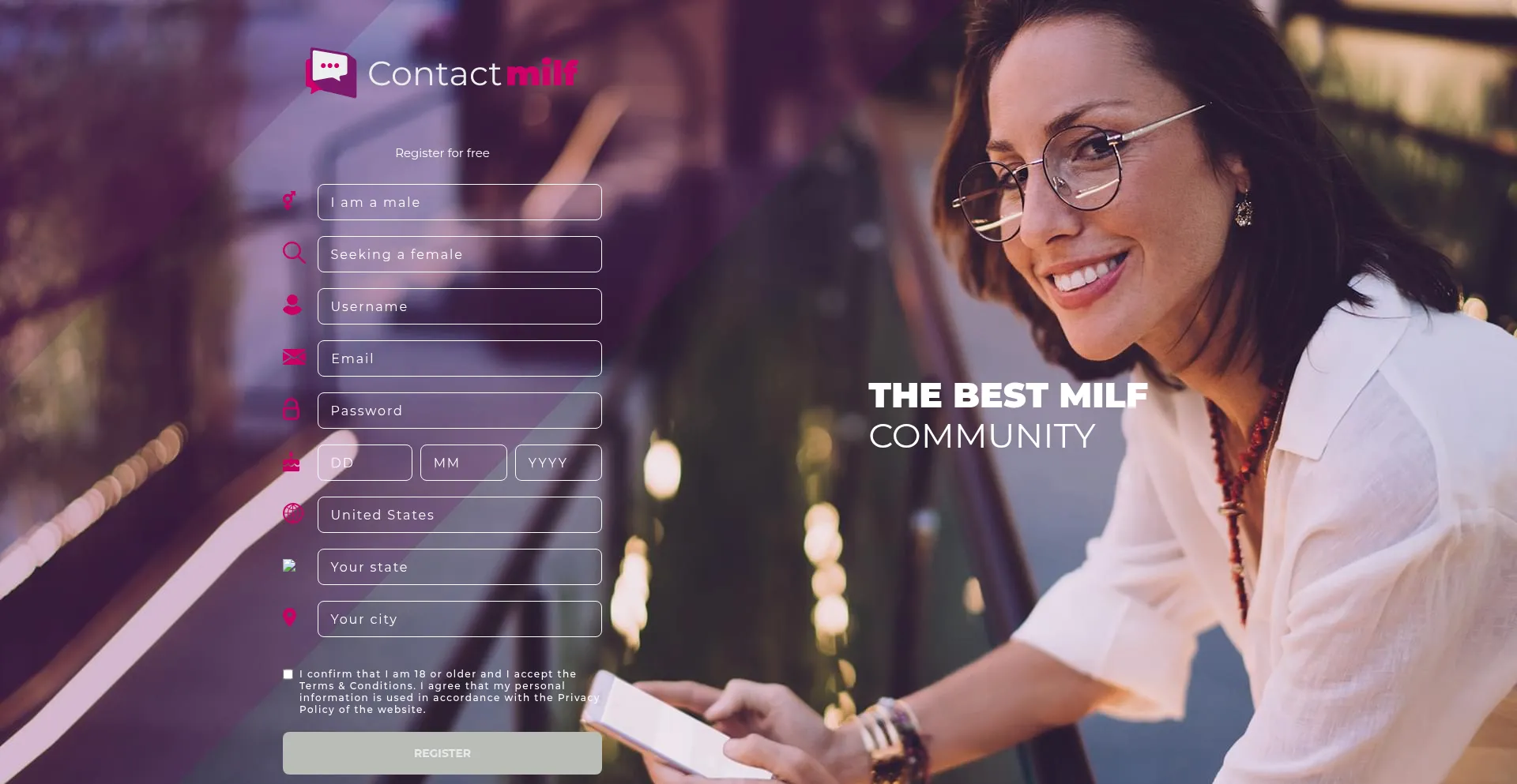 该网站实现数据收集表单,请求个人信息,包括姓名、电子邮件地址、电话号码或其他敏感详细信息。用户应验证 contactmilf.com 的合法性并在提交个人数据前查看隐私政策。