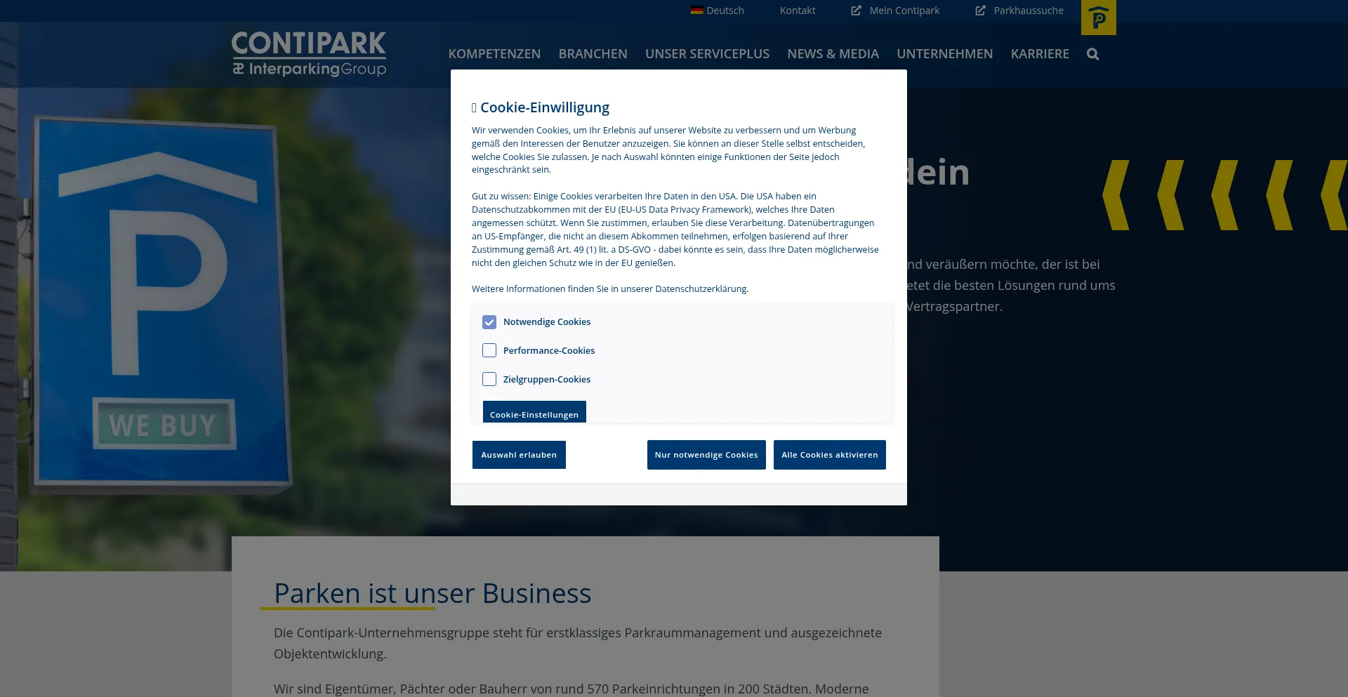 该网站实现符合GDPR或CCPA等隐私法规的cookie同意机制。这表明 contipark.de 遵守数据保护标准并为用户提供对个人数据收集实践的控制。