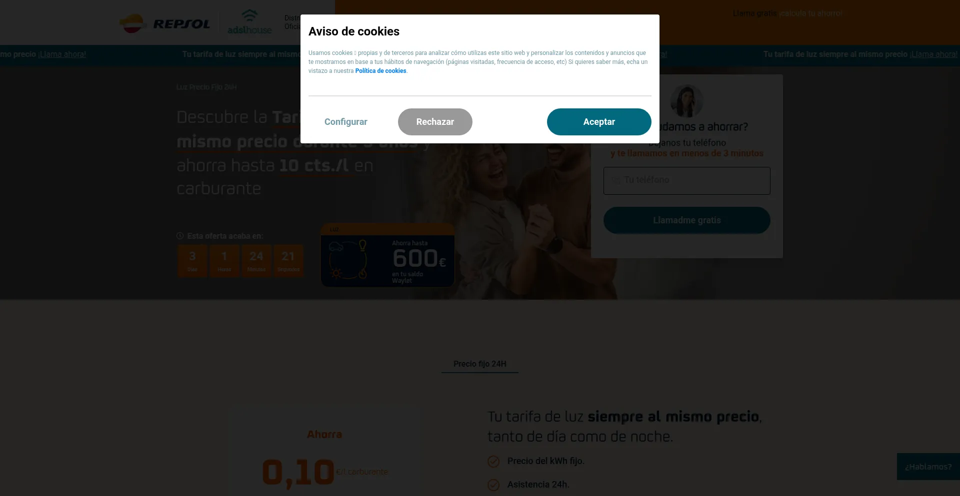 Ahorra hasta 600 € al año contratando una tarifa con Repsol. Disfruta de una tarifa de luz a precio fijo para tu hogar.Te garantizamos el mejor precio del mercado en planes d...