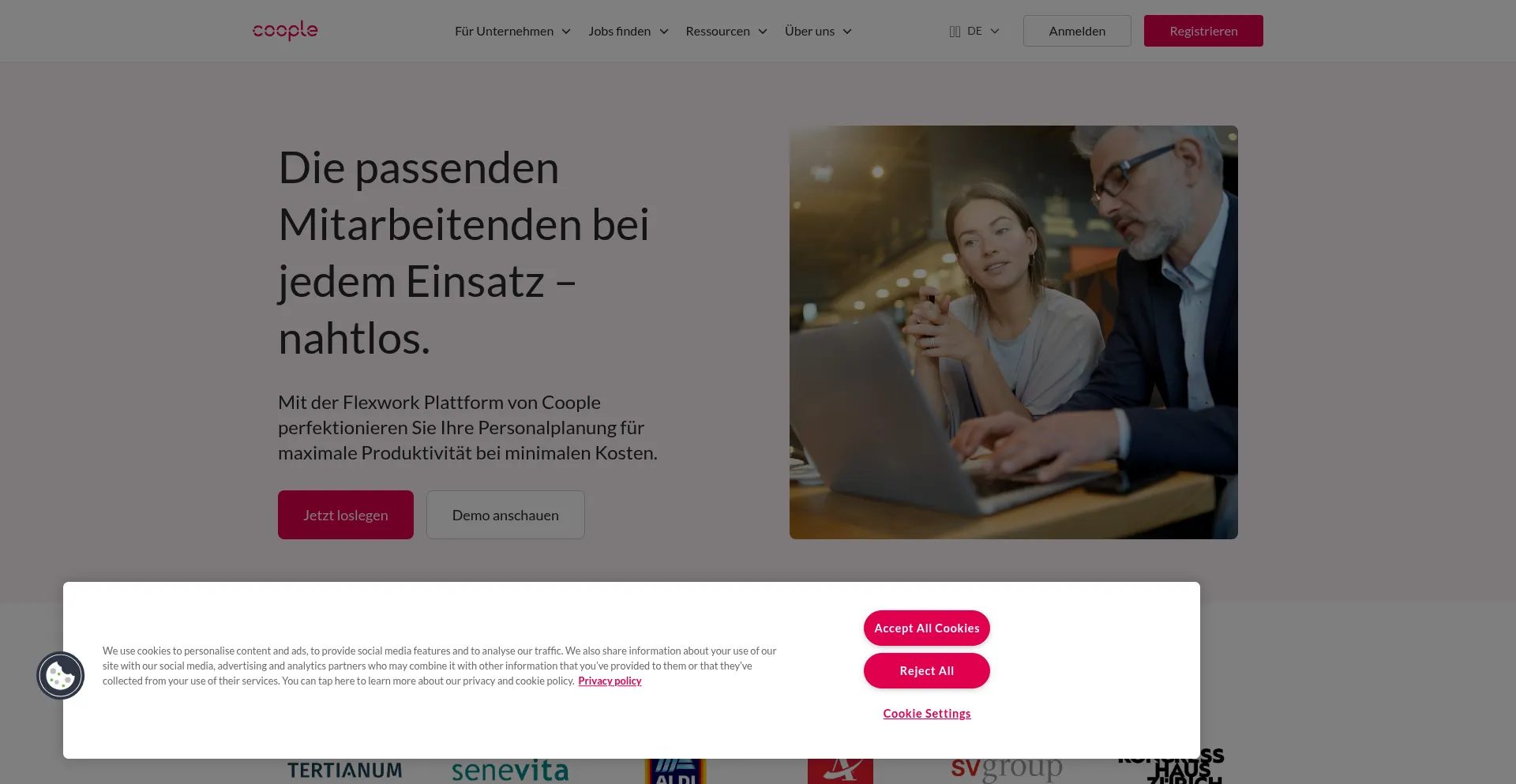 该网站实现符合GDPR或CCPA等隐私法规的cookie同意机制。这表明 coople.com 遵守数据保护标准并为用户提供对个人数据收集实践的控制。